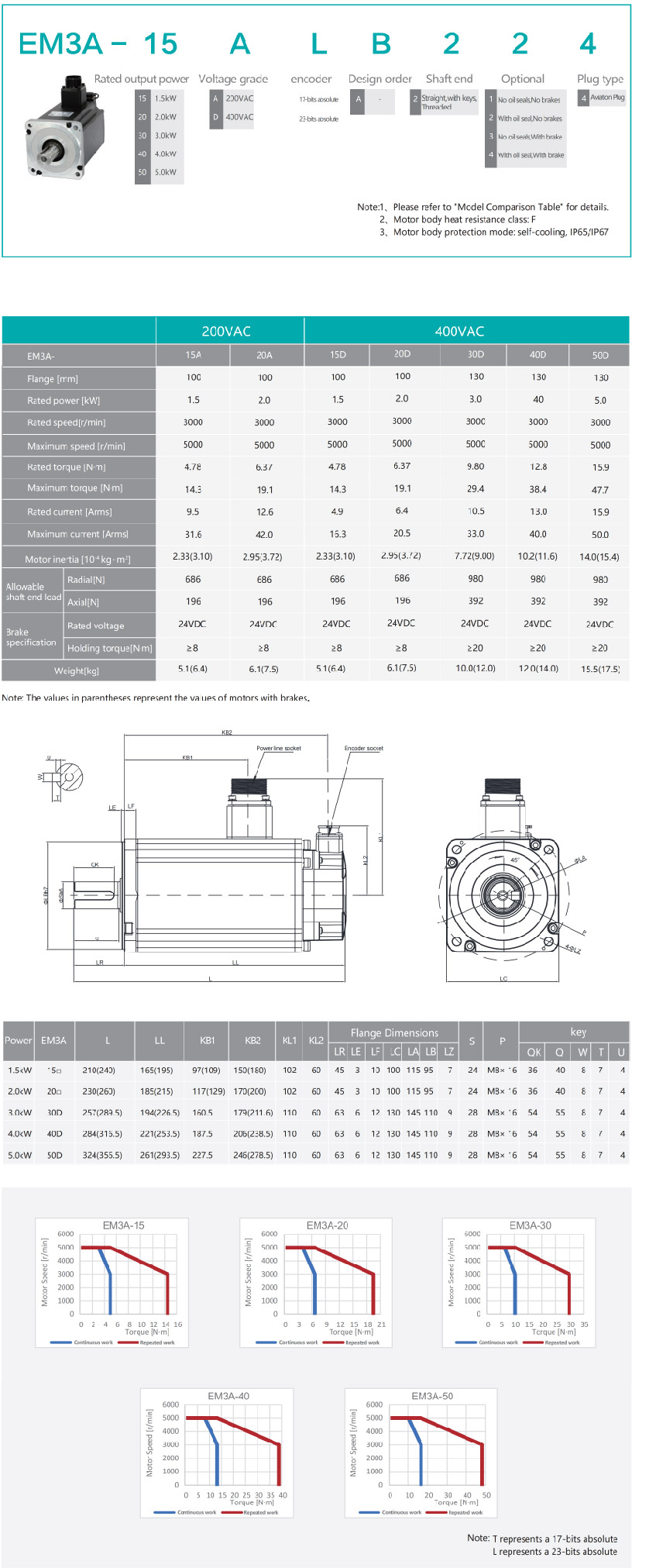 EM3A برای کاربردهای سرعت بالا و دینامیک بالا طراحی شده است و توان 50 وات تا 5 کیلووات را برای برآورده کردن الزامات استحکام مکانیکی بالا (به عنوان مثال، پیچهای اتصال مستقیم) برای کاربردهای beat-to-beat فراهم میکند و برای استفاده در رباتها، تجهیزات تولید نیمههادی، ماشینهای انجماد کریستال، ماشینهای بستهبندی و انواع مختلف تجهیزات 3C مناسب است.