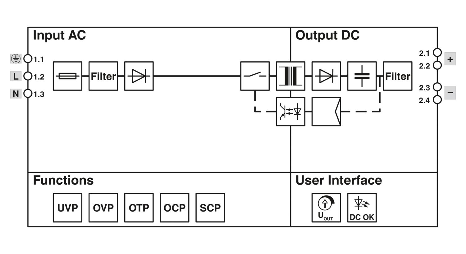 این منابع تغذیه با قابلیت دریافت رنج وسیعی از ولتاژ ورودی AC و DC در دو حالت تکفاز و سه فاز طراحی شده اند. امکان موازی شدن به منظور ارتقاء قابلیت اطمینان Redundant یا افزایش جریان خروجی از دیگر قابلیتهای این سیستم ها میباشد. لازم به ذکر است که منابع تغذیه QUINT به منظور افزایش ولتاژ؛ قابلیت سری شدن نیز دارند.