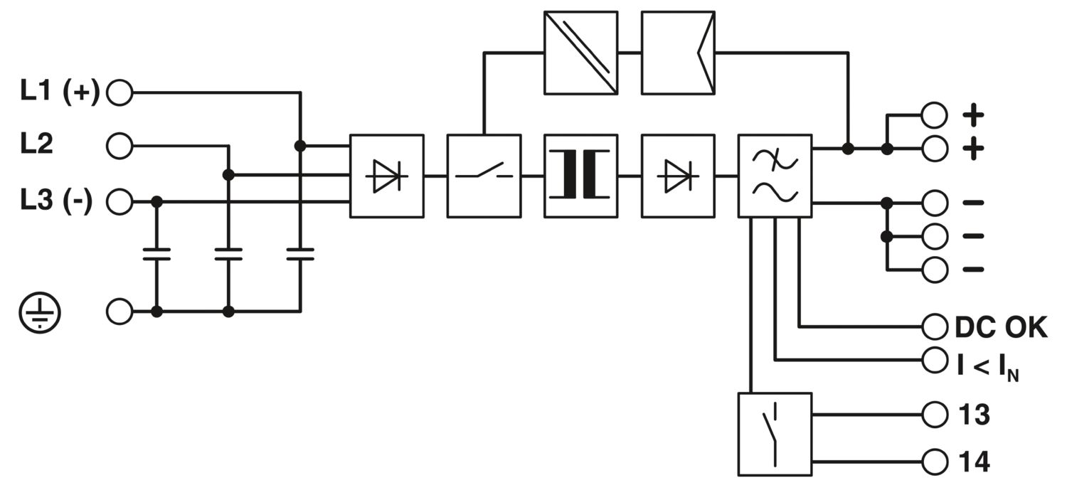 فونیکس کنتاکت مدل QUINT-PS/3AC/24DC/40 در حالت ورودی سه فاز در صورت قطع یکفاز اختلالی در عملکرد سیستم بوجود نمی آید و منبع تغذیه با دو فاز باقیمانده به عملکرد خود ادامه میدهد.