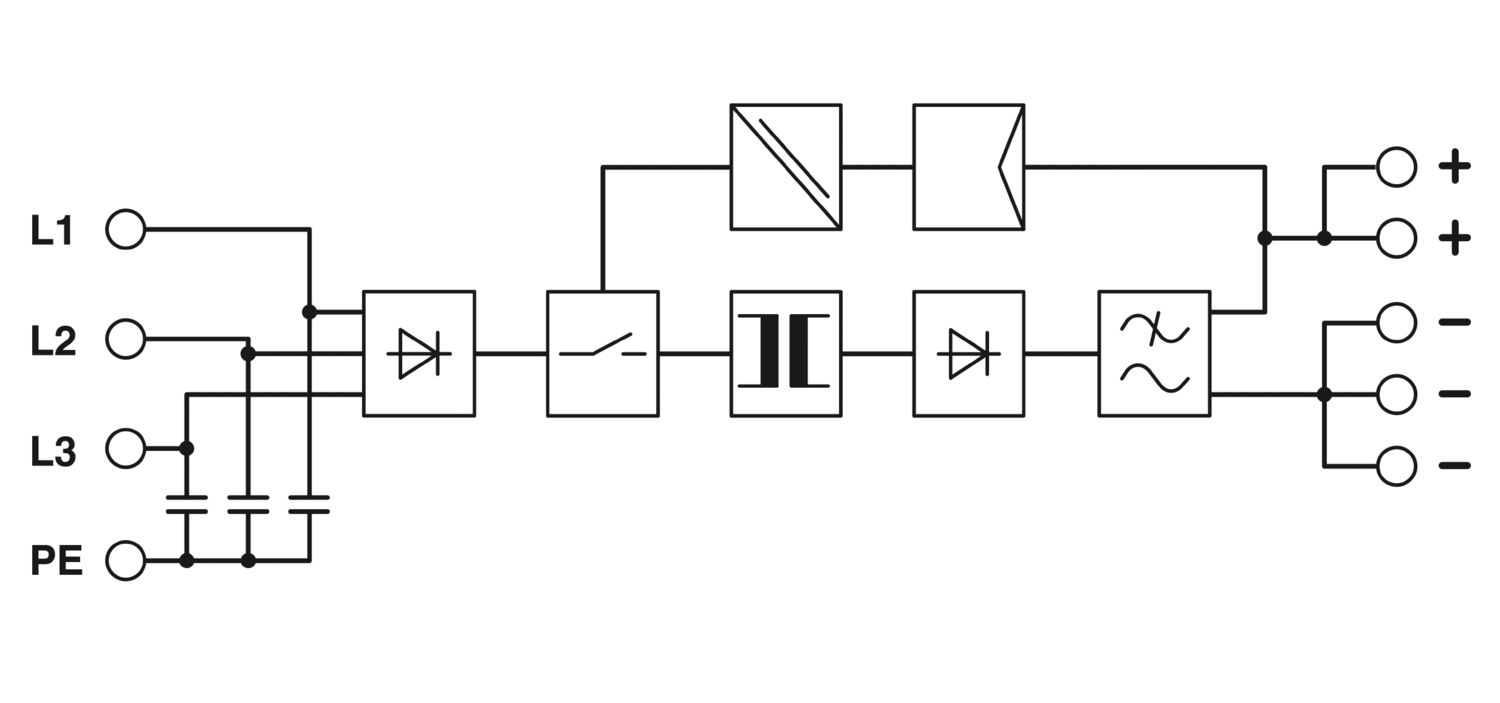 فونیکس کنتاکت مدل TRIO-PS/3AC/24DC/40 در حالت ورودی سه فاز در صورت قطع یکفاز اختلالی در عملکرد سیستم بوجود نمی آید و منبع تغذیه با دو فاز باقیمانده به عملکرد خود ادامه میدهد.